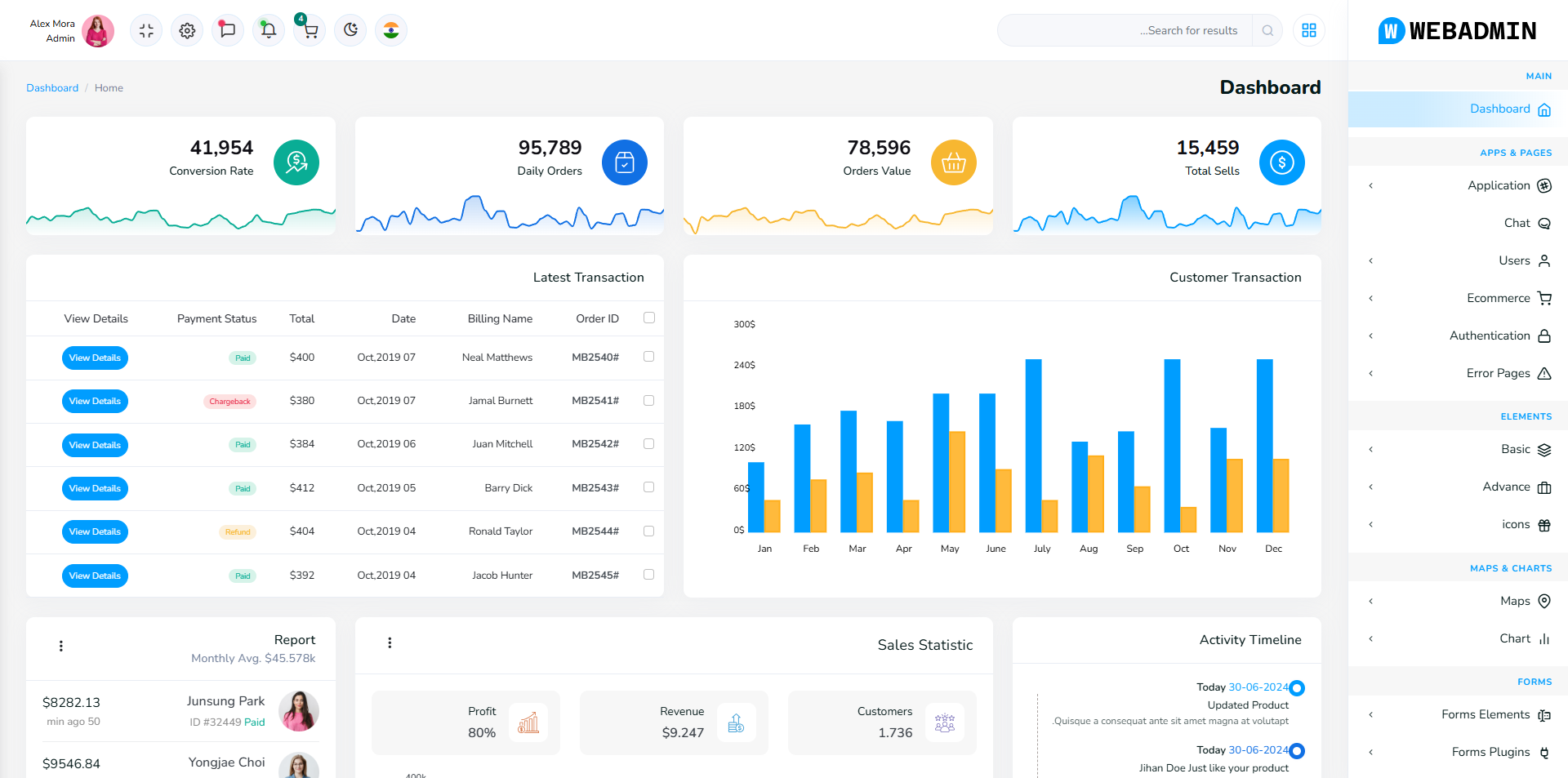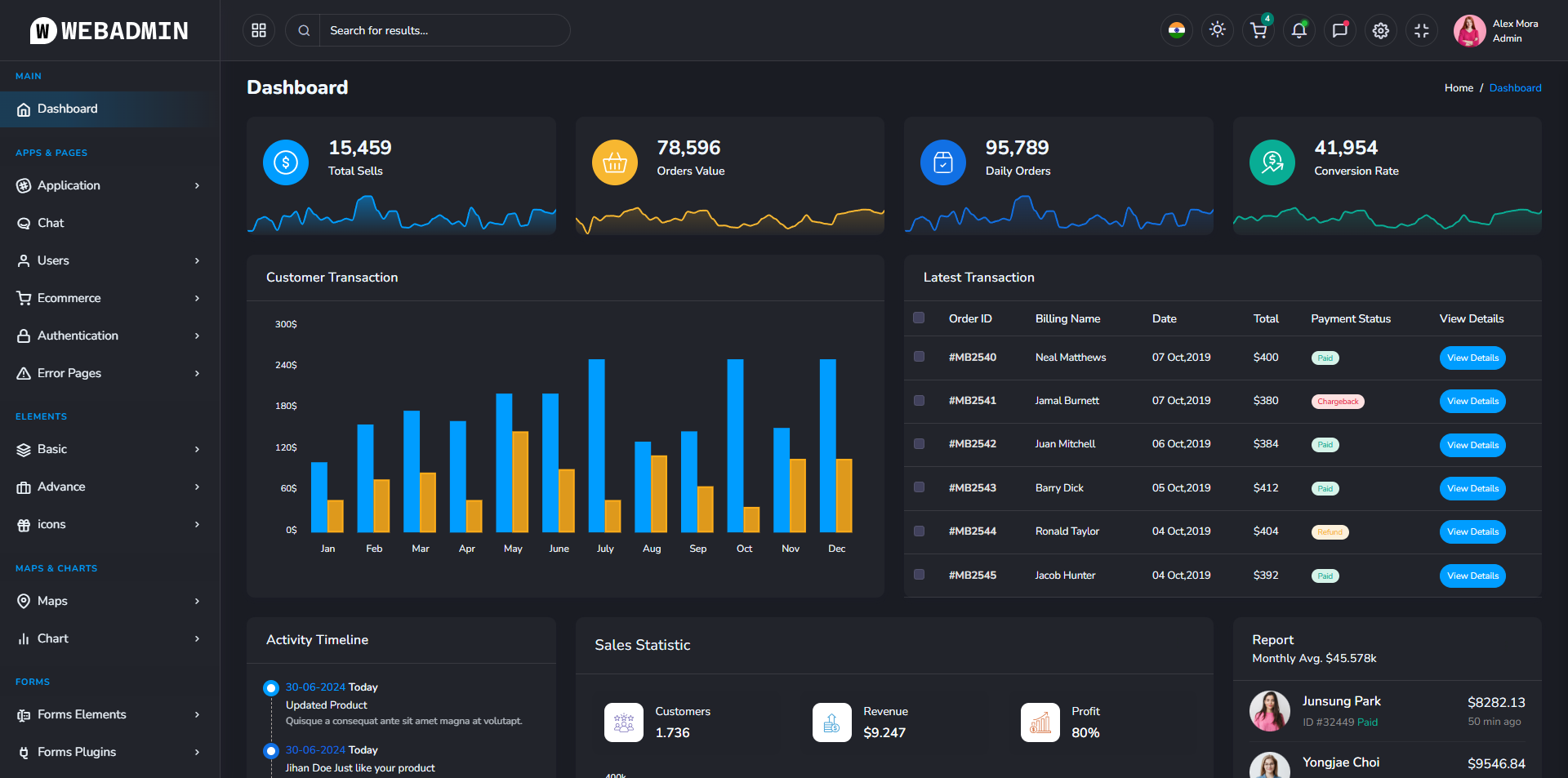 With a wide range of reusable UI components, pre-built pages, and interactive charts, Webadmin helps developers save time and build high-performance admin interfaces effortlessly. Its modular structure and developer-friendly code make customization simple—even for complex applications.